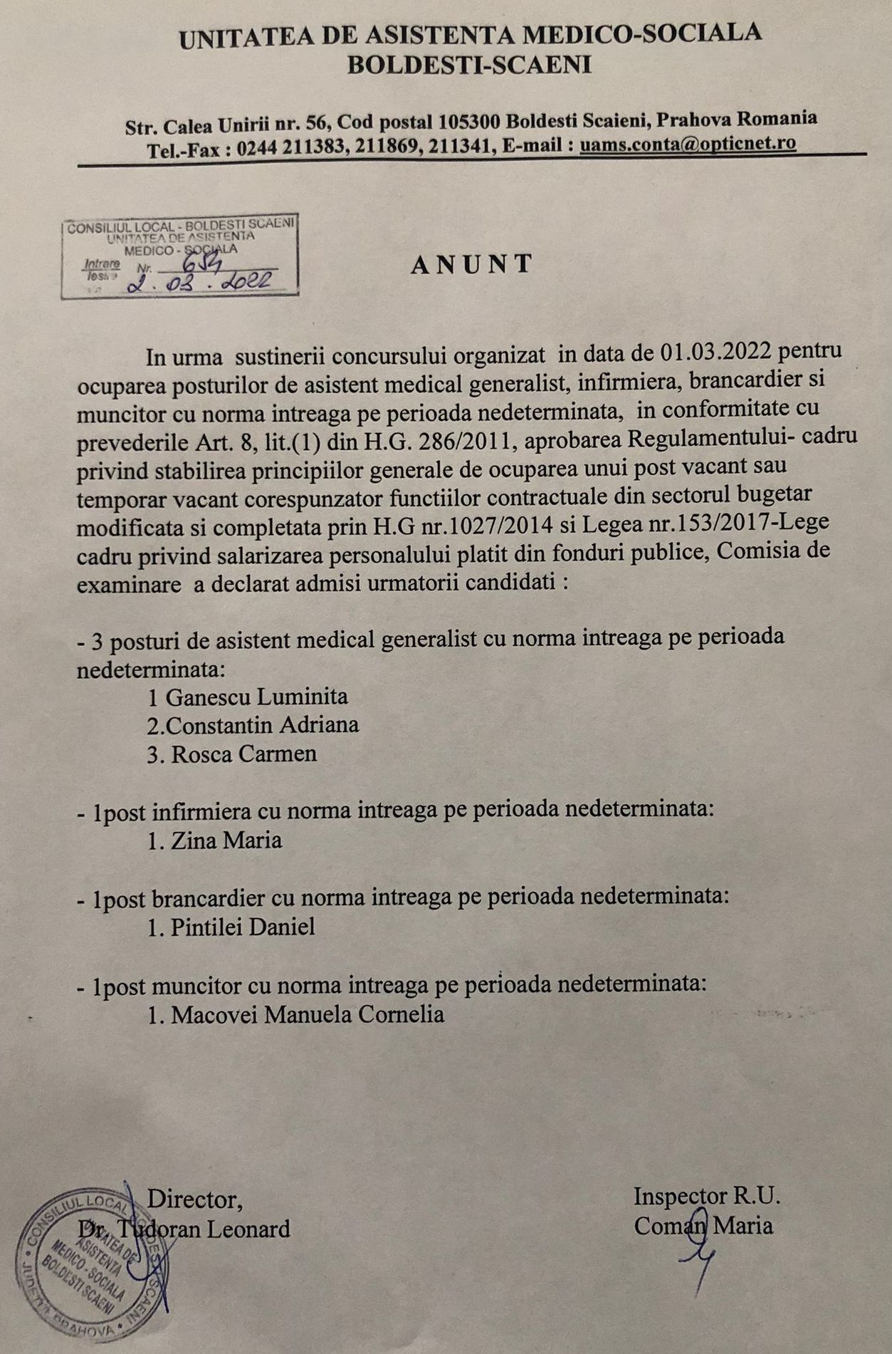 Anunţ scoatere la concurs în data de 14.04.2022 :